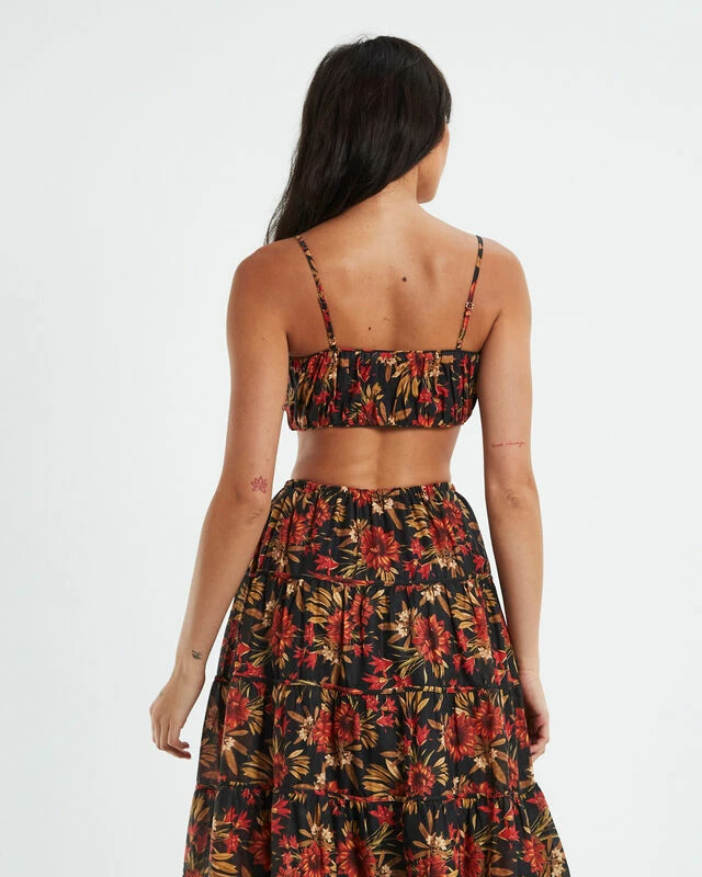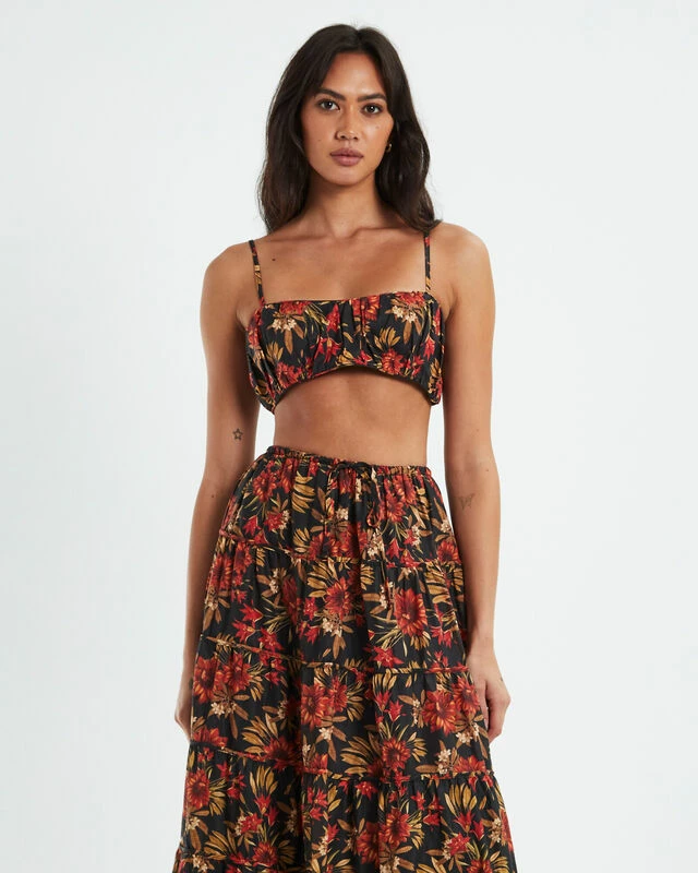 The Willow Top by Charlie Holiday comes in a unique Australiana floral pattern. The top is designed in a bustier style featuring adjustable spaghetti straps, ruched detailing and a cropped length.