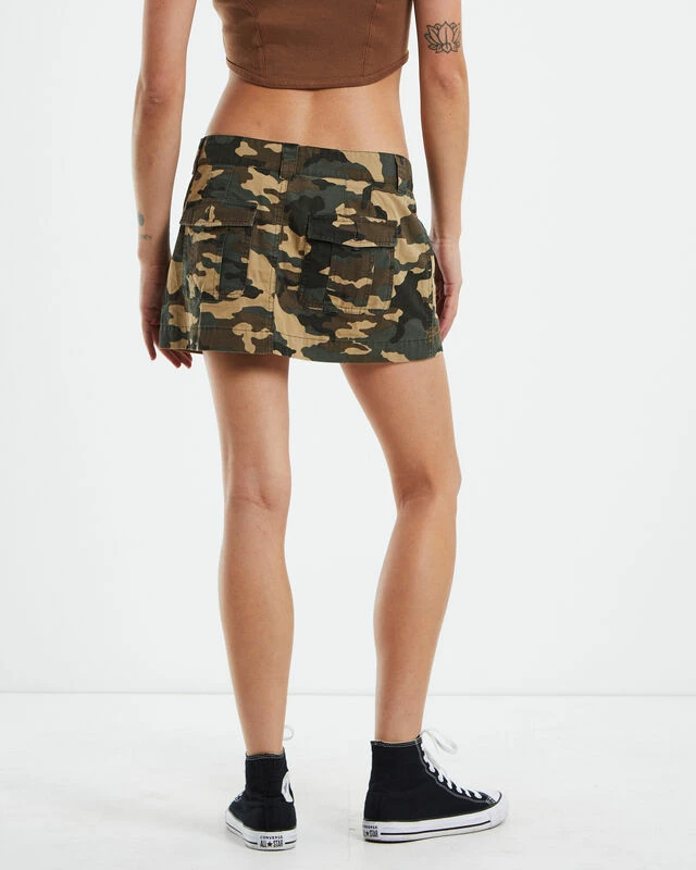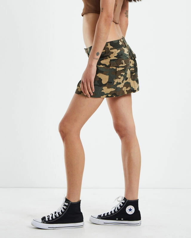 The Work Cargo Mini Skirt by X-Girl is a camo print colourway.The skirt is a mini length with a low rise. It features cargo pockets and belt loops. Pair it back with a baby tee and Converse for a classic vibe.